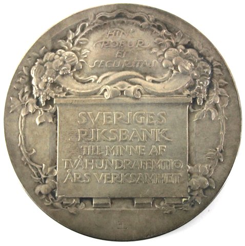 Præget i anledning af Sveriges Rigsbanks 200 års jubilæum i 1918. Diameter 60 mm. Vægt 100,8 gr.