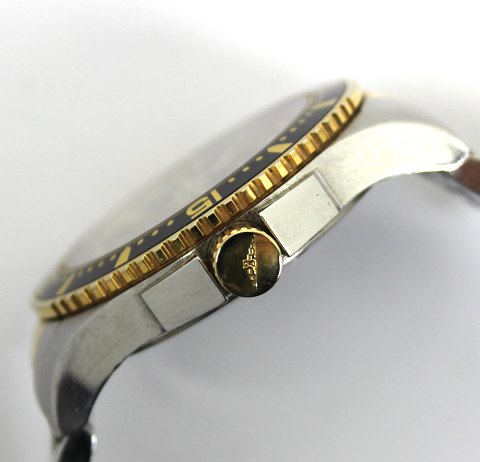 Longines Conquest EFC herrearmbåndsur i urkasse og med lænke af delvist forgyldt metal. Safirglas. Sort skive og lynette med stregindikationer og arabertal, central sekundviser og datovisning i #3 positionen. Quartsværk. Urkasse diameter 40 mm.