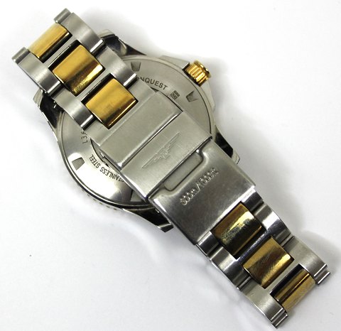 Longines Conquest EFC herrearmbåndsur i urkasse og med lænke af delvist forgyldt metal. Safirglas. Sort skive og lynette med stregindikationer og arabertal, central sekundviser og datovisning i #3 positionen. Quartsværk. Urkasse diameter 40 mm.