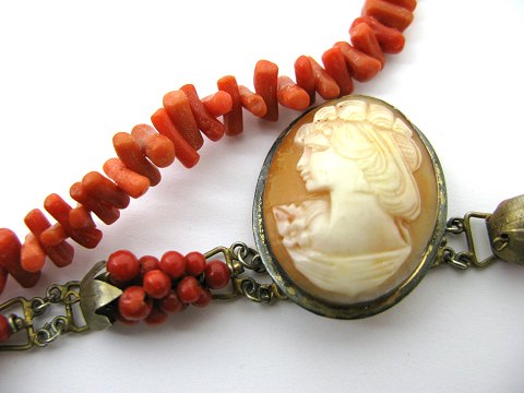 Lot bestående af antik koralhalskæde, L. 37 cm, sjælden koralarmlænke af sølv med led i form af drueklaser, L. 18 cm. samt camé broche af forsølvet metal, 2,5 x 3,5 cm.