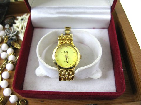 Smykkeskrin af træ, indeholdende Festina og Quioba damearmbåndsur samt halkæder, brocher, ørestikkere, ringe og meget mere.
