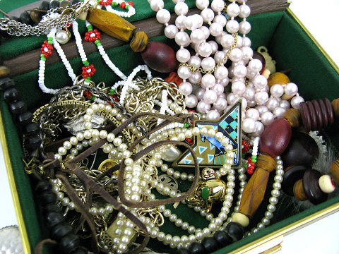 Smykkeskrin indeholdende et utal halskæder og andre smykker.