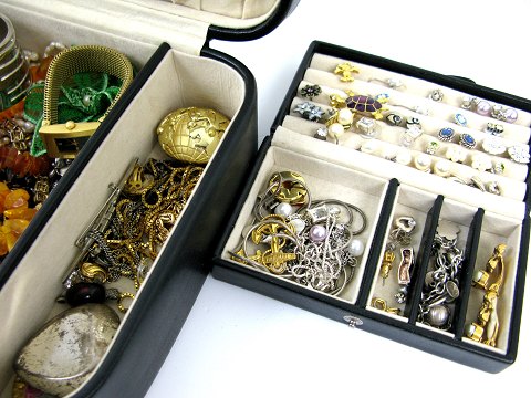 Kvalitets smykkeskrin med masser af bijouteri, par ravkæder og et utal ringe og ørepynt samt smykkeur. Proveniens: Boet efter cirkusprinsesse.