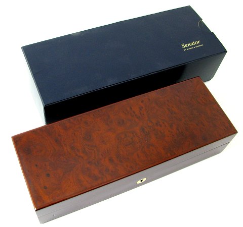 Eksklusiv opbevaringsboks af poleret fugleøjetræ med kongeblå filtindretning til opbevaring af op til 6 armbåndsure.