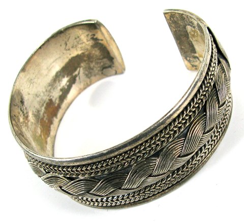 Armring af sterling sølv, prydet med påsatte fletmønstre. Indvendigt mål 60 x 50 mm.