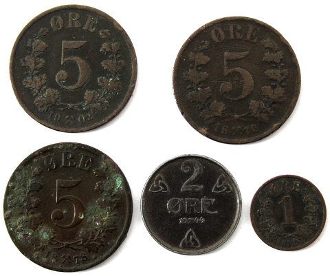 5 øre 1876, 1878 og 1902, 2 øre 1944 og øre 1897