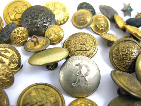 Søværnet, telegraftropper, gardeuniformsknapper m.v. samt 2 udmærkelsestegn.