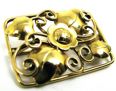 Rektangulær broche af 14 kt. guld, dekoreret med blomster, ranker og bladværk. 30 x 23 mm., vægt 6.0 gr. Fremstillet hos KGJ, Knud Georg Jensen, København før 1948