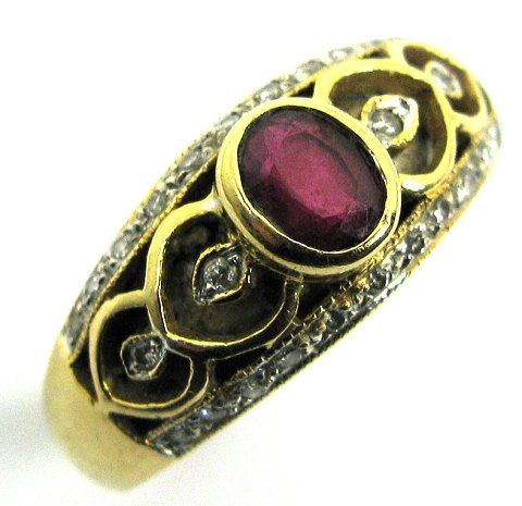 Ring af 18 kt guld med forhøjet front, prydet med 26 mindre brillanter, tilsammen ca. 0,15 ct. samt oval facetsleben og rubinfarvet sten. Ring Str. 54, samlet vægt 5,3 gr.
