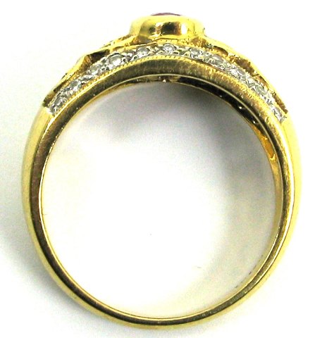 Ring af 18 kt guld med forhøjet front, prydet med 26 mindre brillanter, tilsammen ca. 0,15 ct. samt oval facetsleben og rubinfarvet sten. Ring Str. 54, samlet vægt 5,3 gr.