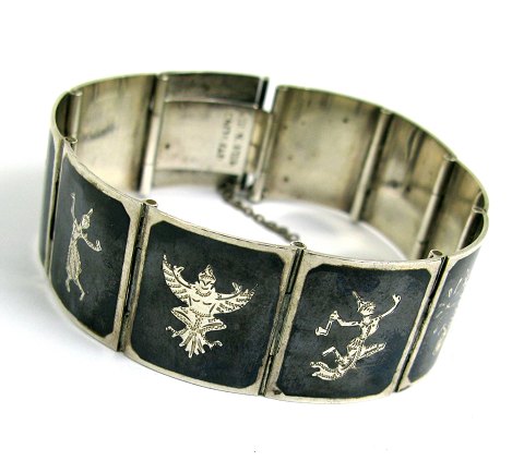 armlænke af sterling sølv, prydet med niello dekorationer i form af danserinder og orientalsk symbolik. L. 17 cm.