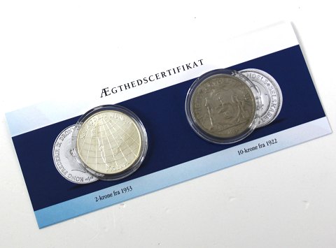 Sæt med 10 kr 1922 HCN, riflet rand og 10 kr sølv *Grønlandsindsamlingen 1953* - H2
