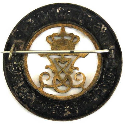 Emblem, fremstillet af aarhusiansk metalvarefirma i anledning af Landsudstillingen i 1909. Udstanset med Frederik VIII's kronede monogram, lignende Dansk 5 øre fra tiden. . Diameter 42 mm.