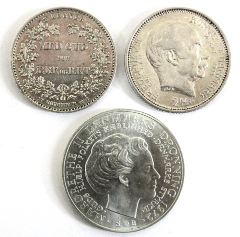 Chr. IX, 2 kr. 1888 *25 års regeringsjubilæum* H 10, Fr. IX / Chr X, 2 kr 1912 *Tronskiftet* og Frederik IX 10 kr 1972 *Tronskiftet*