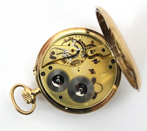 International Watch Co. Schaffhausen, lommeur i urkasse af 14 kt. guld og med inder kapsel af metal. Hvid emailleskive med arabertal og separat sekundviser. Urkasse diameter 49 mm. Lommeur opbevaringskasse fra guldsmed Ejnar Lauritzen Randers medfølger.