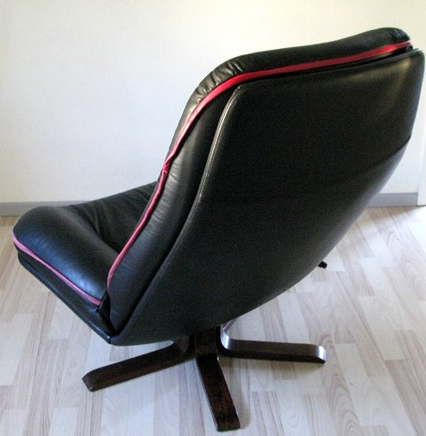 Justerbar Stouby hvilestol med ben af mørkbejdset træ, betrukket med anilin læder med rød kant.