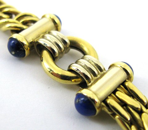 Collier af 18 kt. guld med dobbelt flettede led, hvorimellem ringe med rørsegmenter, afsluttet med cabochonslebne Lapis lazuli. Front i form af treradet lænke. L. 45 cm. Vægt 52 gr.