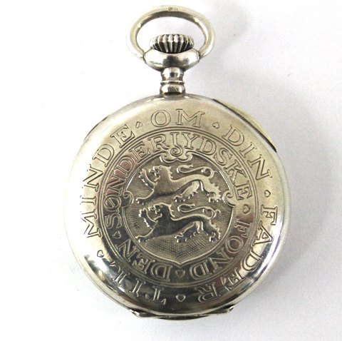 Schweizisk Antoine Fréres pige lommeur i urkasse af sølv. Bagside med gravure i form af dobbeltløve og logo fra den sønderjyske fond. Hvid emailleskive med arabertal. Urkasse diameter 30 mm.