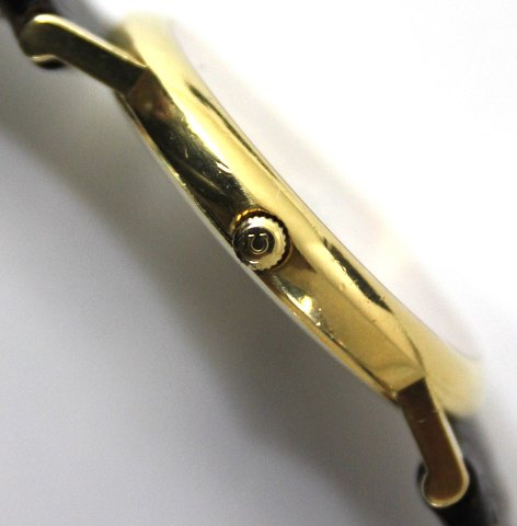 I kasse af guld 18 kt. Rem af læder. Gul urskive med guld-diskrete visere. Kvartsværk. Ridsefri safirglas. Træk/skub Krone. Solid bagkasse. Urkasse diameter: 37 mm.