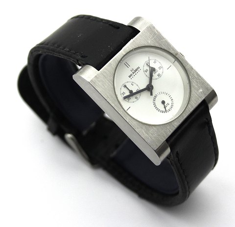 Skagen herrearmbåndsur i rektangulær urkasse af stål med hvid skive, stregindikation, separat sekundviser, dato- og minut visning. Quartzværk. Urkasse 30 x 30 mm. Læderrem med metallænke.