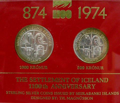 Island, 1000 kronur samt 500 kronur sølv 1974, 50 kronur nikkel 1968 samt bronzemedalje 1978. Alle i originale opbevaringsæsker.