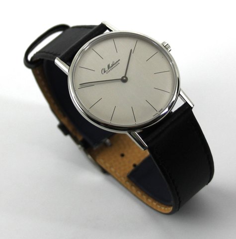Herrearmbåndsur fra Ole Mathiesen, København, m. kasse af stål, sølvfarvet skive, plexiglas, quartz-urværk og læderrem.