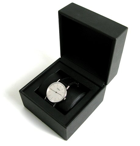 Herrearmbåndsur fra Ole Mathiesen, København, m. kasse af stål, sølvfarvet skive, plexiglas, quartz-urværk og læderrem.