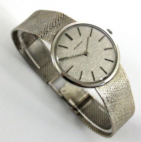 Luksus herrearmbåndsur fra schweiziske Juvenia, i kasse af 18 kt. hvidguld m. integreret lænke ligeledes i 18 kt. hvidguld, satineret sølvfarvet skive m. stregindeks, manuel optræk. Ø. 33 mm.