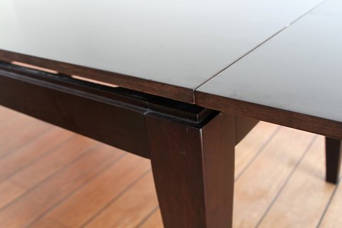 Koefoed spisebord med hollandsk udtræk af wengéfarvet finer. 150 x 90 cm., med udtræk 270 x 90 cm., H. 73,5 cm. Salgspris for tilsvarende: kr. 15.000.-