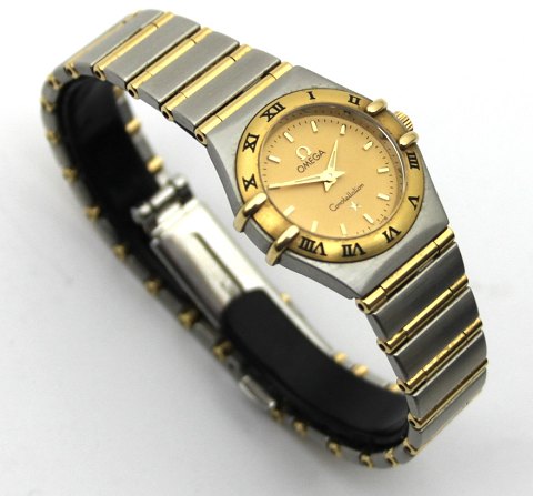 Omega Constellation Damearmbåndsur i urkasse og med lænke af guld/stål. guld farvet skive med stregindikationer, Quartzværk. Urkasse Diam. 23 mm. Serie nr. 56XXXXXX