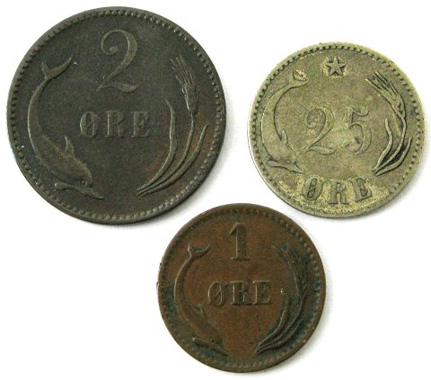 Christian IX, 1 og 2 øre samt 25 øre sølv, alle 1891