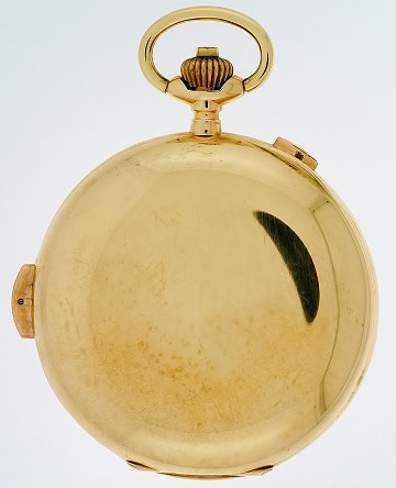 Kraftigt, dobbeltkapslet jagtlommeur i kasse af 14 kt. guld, støvkapsel ligeledes af 14 kt. guld, hvid emailleskive m. arabertal, stopurs-funktion, seperat sekundviser (mangler), chronograf, forgyldte visere, delvist forgyldt repetitionsværk. Ø. 58 mm.