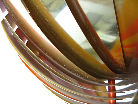 1970'er Pendel af sammensatte, kraftige messinglameller, indvendig skiftevis lakeret i røde og orange farver. Diameter ca. 38 cm., H. 40 cm. Monteret med sort stofledning og porcelænsfatning E27. Stemplet forneden: Made in Denmark.