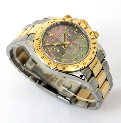 Rolex Daytona chronometer herrearmbåndsur, ref. nr. 116523 i urkasse og med lænke af guld/stål. perlemor skive med romertal, separat sekundviser, chronometer funktioner. Automatisk værk. Urkasse diameter 40 mm.