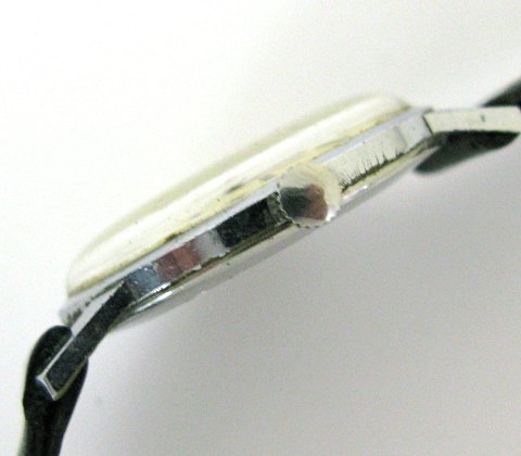 Tissot herrearmbåndsur i urkasse af stål, lys skive med stregindikation og central sekundviser. Manuel mekanisk værk. Urkasse diameter 34 mm., læderlænke med metalspænde. Skiven med slidmærker fra timeviseren.