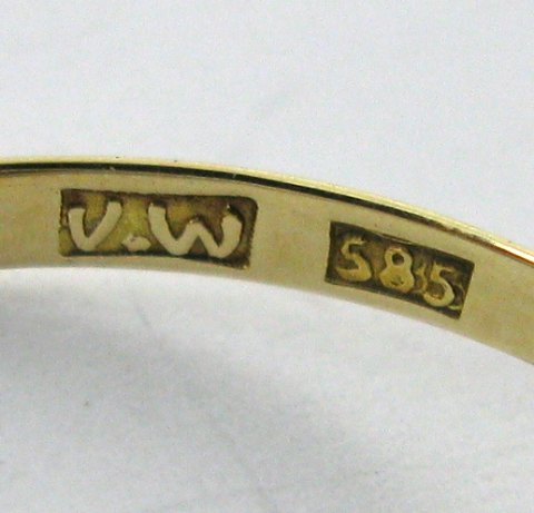Gl. ring af 14 kt. guld med front i skønvirkeform, prydet med halv 5 mm. perle. Ring str. 55½, vægt 1,7 gr. Viggo Wollny København 1921-1973
