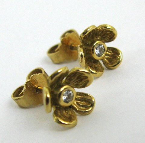 Par blomsterformede ørestikker af 18 kt, guld, hver prydet med brillantsleben diamant, tilsammen 0,05 ct. Samlet vægt 2,7 gr. Roset diameter 9 mm.