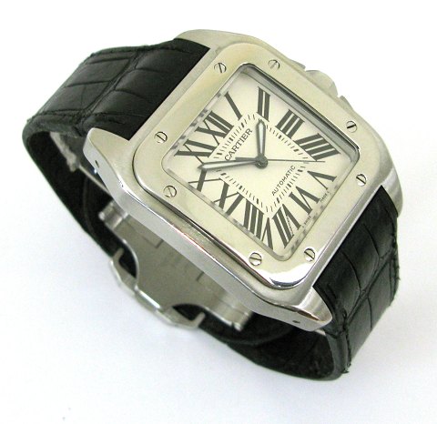 Cartier Santos 100 herrearmbåndsur, ref. nr. W20073X8, i urkasse og med lænke af stål. Hvid skive bag safirglas med romertal, separat sekundviser, safirprydet krone. Automatisk værk. Urkasse 51 x 42 mm.