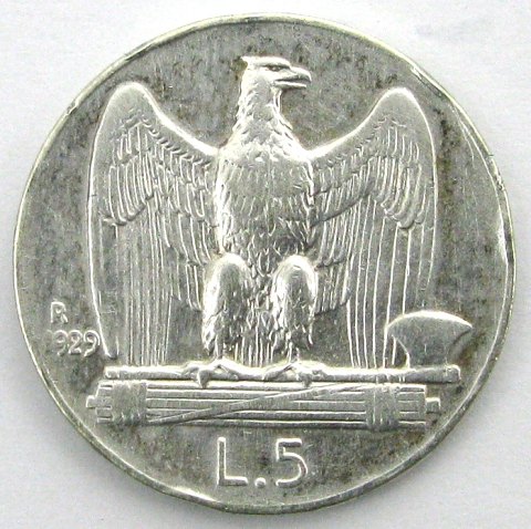 Italien, Vittorio Emanuele III, 5 Lire sølv 1929R - KM 67.1
