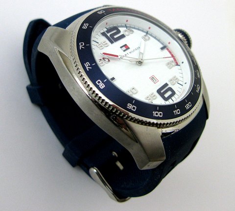 Tommy Hilfiger Tachymeter herrearmbåndsur i urkasse af stål med hvid skive, streg og talindikationer samt 20 sekunder segment. Centralsekundviser og datovisning i #6 positionen. Quartsværk, petroleumsblå gummirem med metalspænde. Urkasse diameter 50 mm.