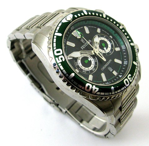 Festina chronograph herrearmbåndsur, ref. nr. 16564 i urkasse og med lænke af stål. Sort/grøn skive med central sekundviser, stregindikation, datovisning i #6 positionen, chronograph funktioner. Quartsværk. Urkasse diameter 46 mm.