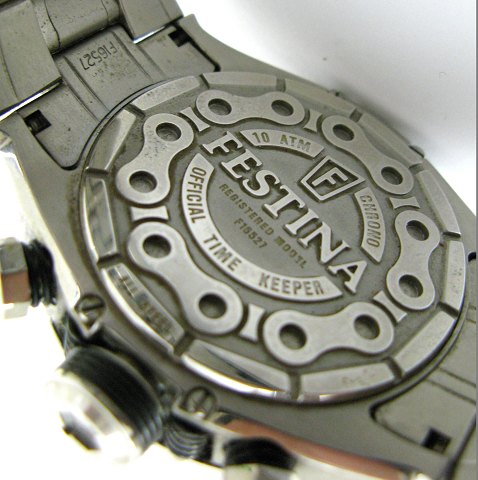 Festina chronograph herrearmbåndsur i urkasse og med lænke af stål. Sort struktureret skive med separat sekundviser, delvist grøn farvet stregindikation, dag/datovisning i #3 positionen og chronograph funktioner. Quartsværk, urkasse diameter 47 mm.