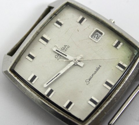 Omega seamaster fra 1970'erne i urkasse af metal. Ligesidet metalfarvet skive med stregindikation, central sekundviser og datovisning i #3 positionen. Urkasse 34 x 34 mm. Krone og læderrem mangler.