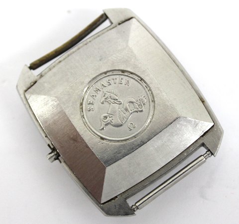 Omega seamaster fra 1970'erne i urkasse af metal. Ligesidet metalfarvet skive med stregindikation, central sekundviser og datovisning i #3 positionen. Urkasse 34 x 34 mm. Krone og læderrem mangler.