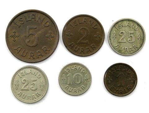 1 eyrir 1926, 2 aurar 1926, 5 aurar 1926, 10 aurar 1929, 25 aurar 1922,1923
