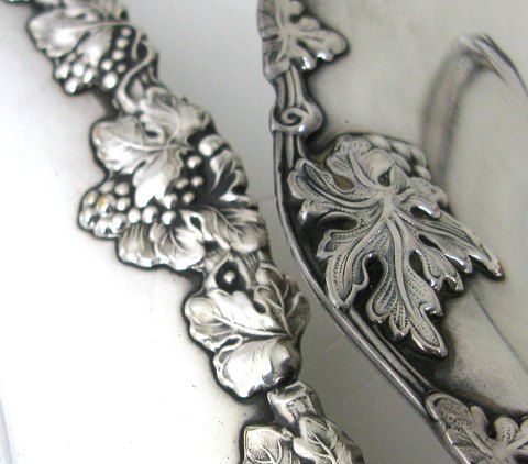 Flad pg dyb fad af sølvplet, begge kantdekoreret med drueklaser og bladværk. Diameter 35 og 27 cm.