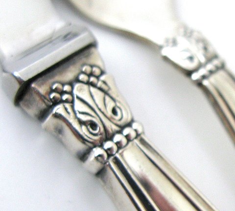 Lot bestående af 7 kaffeskeer, 3 kagegafler og kagekniv. 2 andre gafler af sølv medfølger. Samlet vægt uden kagekniv 239 gr.