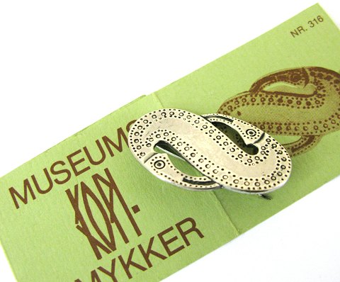 Broche af sterling sølv, kopi efter fund fra Hvorlris ved Viborg. L. 42 mm, vægt 13 gr.