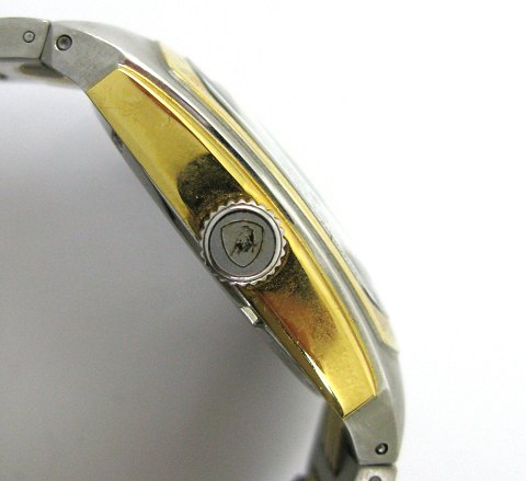 Tonino Lamborghini herrearmbåndsur i urkasse og med lænke af delvist forgyldt stål. Ligesidet , metalfarvet skive med arabertal, separat måned, dag og datoindikation. Quartsværk. Urkasse diagonal 50 mm. Nypris: kr. 8195.-