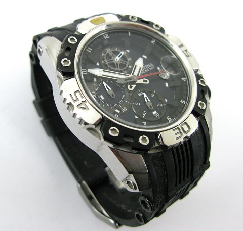 Festina chronograph herrearmbåndsur i urkasse af stål og lænke af sort gummi med metalspænde. Sort struktureret skive med separat sekundviser, stregindikation, datovisning i #3 positionen med forstørrelsesboble, chronograph funktioner. Quartsværk. Urkasse diameter 46 mm.
